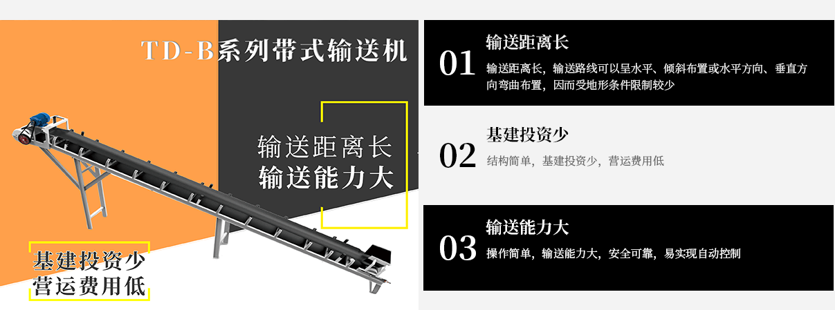 The belt conveyor is a continuous operation conveyor equipment, which is mainly used to transport a large amount of bulk goods in the metallurgy, mining, coal, building materials and other industries and transportation departments, such as ore, coal, sand and other powders, bulk goods, TD- The B series belt conveyor adopts a new combined structural design, which is convenient for transportation and installation. It can provide on-site production and installation according to customer needs, saving installation costs. It has been widely used in various types of sand and stone yards, ore sorting, and commercial mixing stations. , Construction aggregate, coal sorting and other fields.