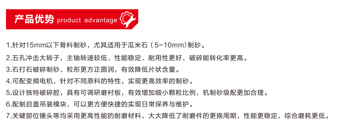 三銘重工UL系列立軸式超細(xì)碎制砂機(jī),是我公司結(jié)合國內(nèi)外先進(jìn)的破碎制砂理念,依托多年國內(nèi)破碎制砂經(jīng)驗(yàn),研發(fā)的一款以15mm以下小碎石為原料的超高性能制砂破碎設(shè)備。其繼承了傳統(tǒng)沖擊破穩(wěn)定、磨耗小的優(yōu)點(diǎn),而且成品砂粒形方正圓潤,級配合理,完全滿足國內(nèi)對高品質(zhì)機(jī)制砂的質(zhì)量要求。尤其適用于高品質(zhì)機(jī)制砂的生產(chǎn),粒形更方正、片狀更低、級配更合理,可滿足國內(nèi)對高品質(zhì)機(jī)制砂的質(zhì)量要求。