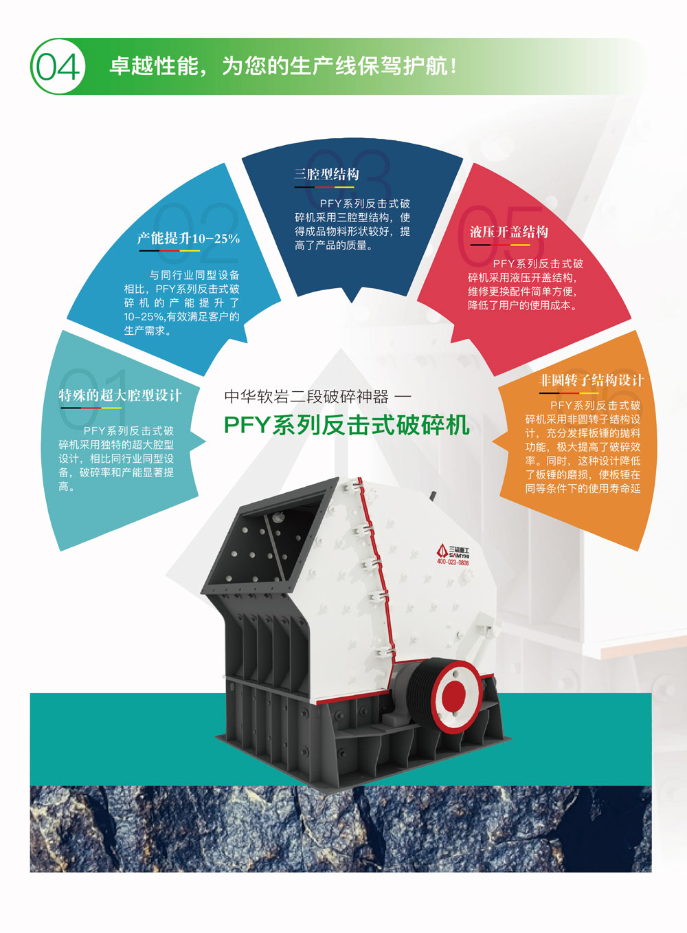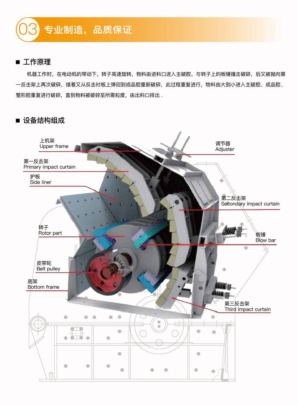 本系列產(chǎn)品是我司優(yōu)化設計而研制出的一款三腔型反擊式破碎機,具備結構合理、破碎比大、產(chǎn)量高、能耗低、維修方便等特點,特別適用于抗壓強度不超過250Mpa的各類物料的中碎和細碎,是高等級公路、鐵路、水電、化工、建筑耐火材料、陶瓷、玻璃等行業(yè)所用物料的理想設備。